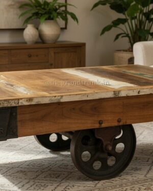 Industrial Heritage Cart Table – Reclaimed Artisan Coffee Table on Wheels