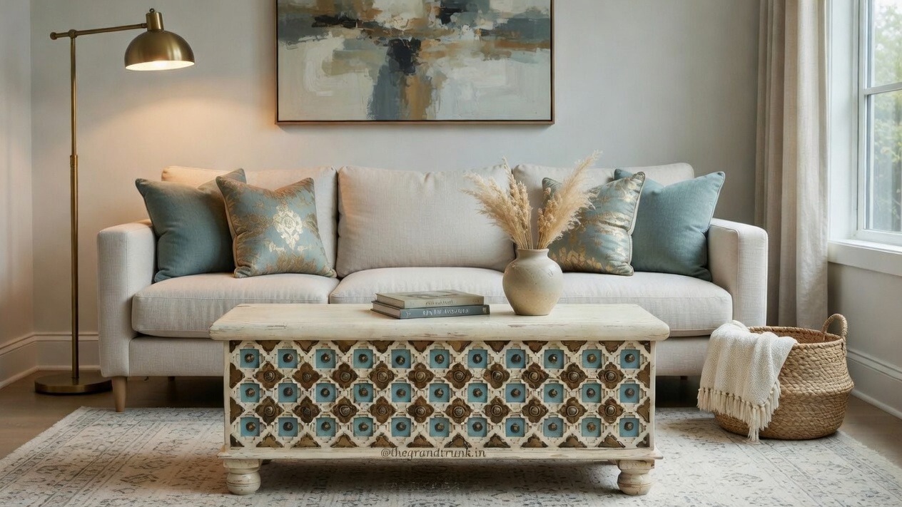 Each geometric inset is accented with a soft azure blue backing and central brass studs, adding a refined pop of color and tactile dimension against the neutral frame. Beyond its striking visual appeal, this substantial trunk is a master of utility; its expansive, low-profile silhouette is perfectly proportioned to function as a coffee table or a sophisticated storage bench. Set upon sturdy, hand-turned bun feet, it balances ethnic inspiration with a refined luxury that anchors any living space with a sense of history.