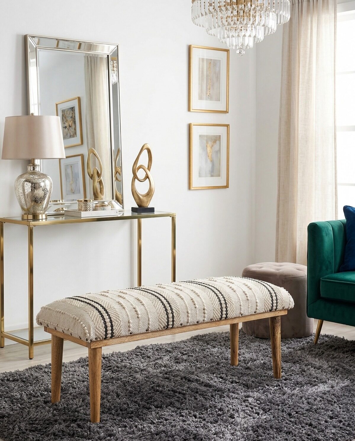This wooden bench with a cushion is a perfect marriage of style and comfort. Crafted from a rich sturdy wood it exudes an elegant and timeless charm. The smooth grains of the wood showcase its natural beauty adding warmth and character to any space it occupies. The bench features a cushioned seat that provides a plush and cozy sitting experience. The cushion is upholstered in a soft durable fabric meticulously chosen to complement the bench’s design. It offers a delightful balance between support and comfort allowing you to relax for extended periods. Its sturdy construction ensures stability and longevity while the graceful curves and sleek lines add an element of sophistication. Whether placed in a garden on a patio or in a hallway this wooden bench with a cushion effortlessly enhances the aesthetic appeal of any environment. It serves as a welcoming spot in an entryway creating a cozy nook to help transition into a home. Placed in a garden or courtyard it offers a serene and inviting place for contemplation and relaxation. Additionally the bench can be used in a living room or a dining area adding a touch of adorable charm to the overall decor. This wooden bench with a cushion is an elegant and comfortable seating option that seamlessly blends into any space while adding a touch of natural beauty. Its inviting design and practicality make it an ideal choice for those who appreciate both aesthetics and comfort.