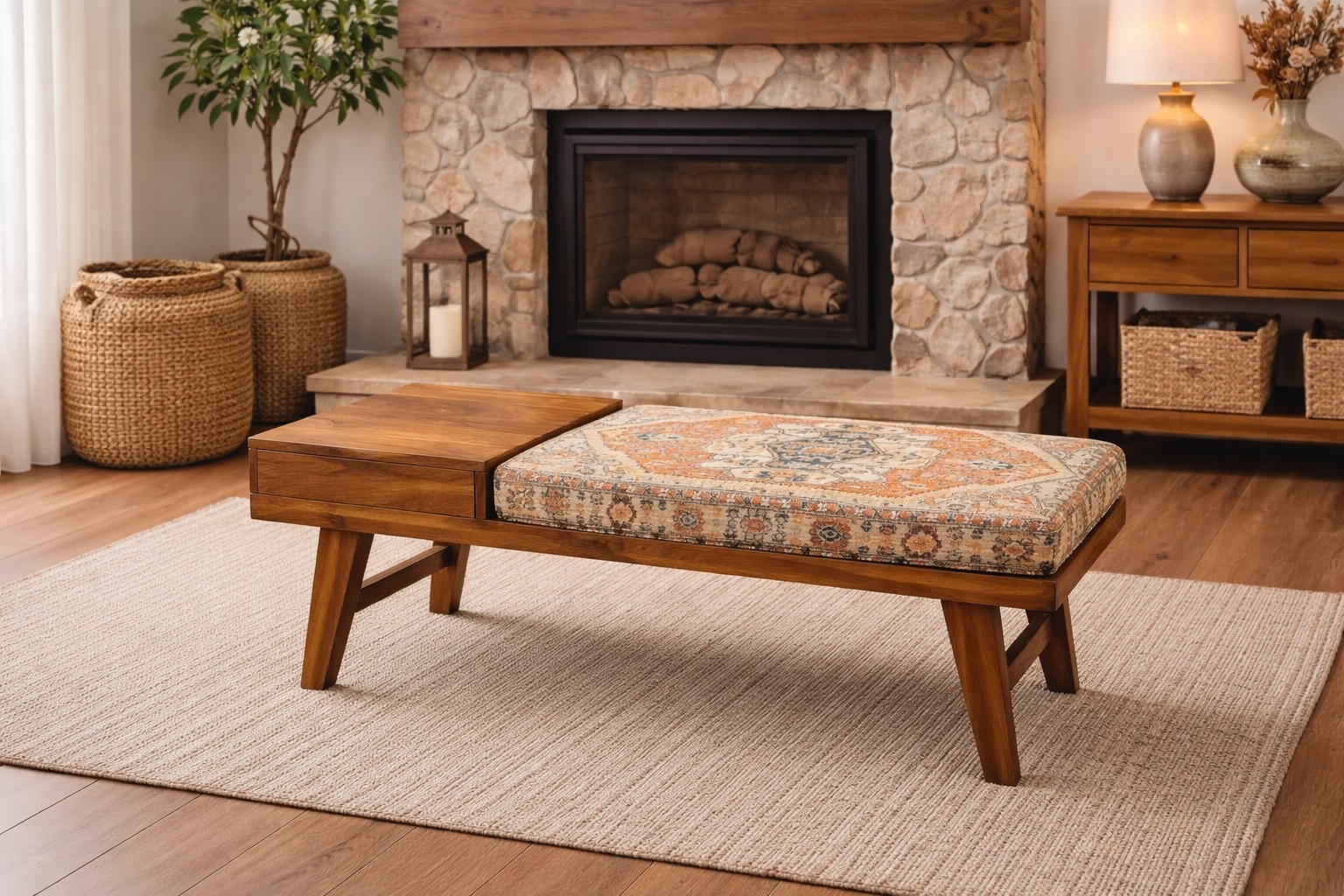 This teakwood cushion bench with drawer beautifully blends comfort, functionality, and timeless design. Handcrafted from premium teak wood, it showcases rich natural grains and a warm golden hue. The soft, upholstered cushion offers comfortable seating, while the built-in drawer provides convenient storage for everyday essentials. Perfect for entryways, bedrooms, or living spaces, this bench adds a touch of elegance and practicality to any interior.Hashtags: