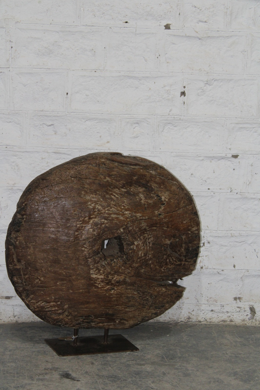 An antique bullock cart wheel stand is a rustic and charming artifact that evokes the rural and agricultural heritage of past centuries. Typically originating from regions where bullock carts were a primary means of transport and labor, these wheel stands are crafted from sturdy wood.