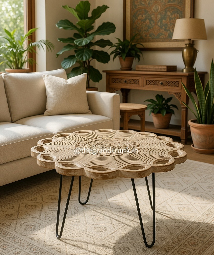 A masterful expression of rhythmic geometry and traditional craftsmanship, this handcrafted coffee table serves as a captivating focal point for the modern home. The piece is defined by its iconic circular “flower-petal” top, featuring high-relief scalloped edges and a magnificent hand-carved central Mandala motif. The specialized distressed finish in a light sand tone highlights the intricate concentric textures and artisanal detailing, bringing a sense of curated history and organic warmth to your living space.