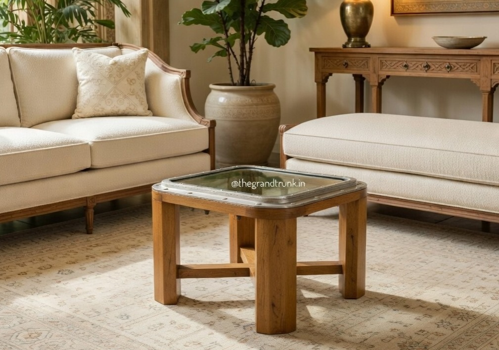 A masterful intersection of maritime history and modern architectural form, this handcrafted coffee table serves as a sophisticated anchor for the curated home. The piece is defined by its iconic “porthole” top, featuring a thick tempered glass inset encased in a hand-forged metallic frame with authentic rhythmic rivet detailing. The specialized brushed steel finish offers a refined industrial luster that catches the light, creating a high-end, gallery aesthetic that grounds your living space with soulful character.