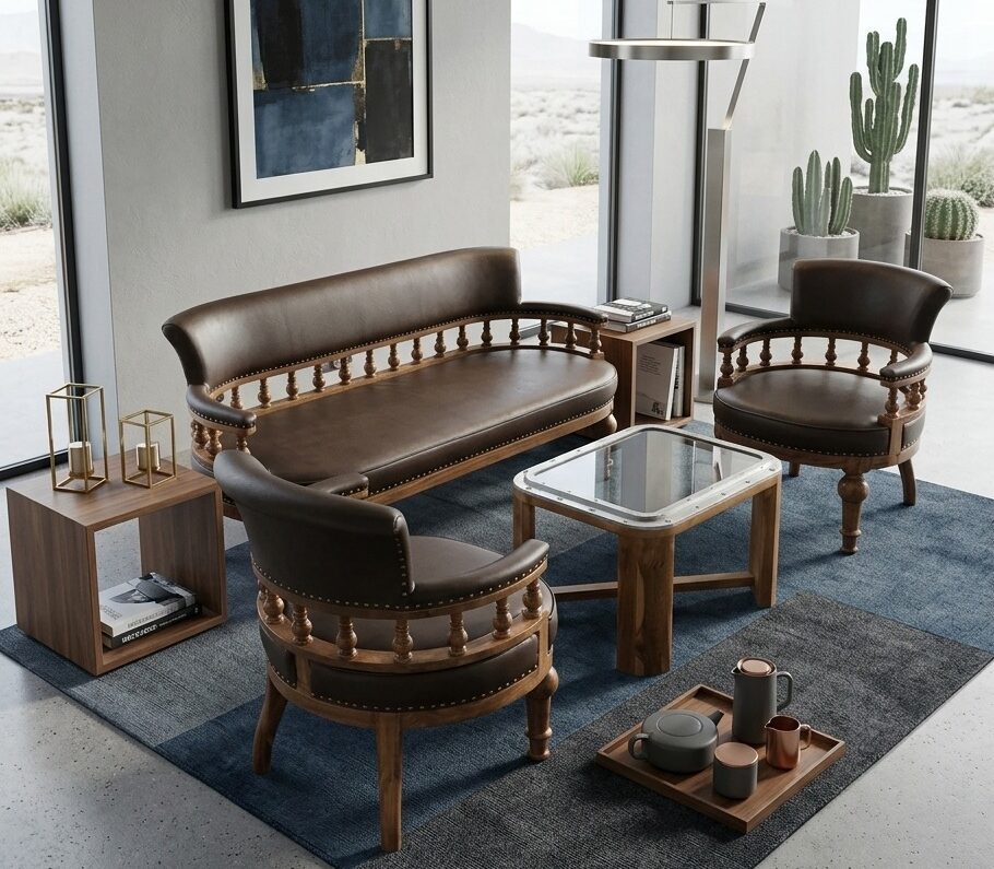 A masterful fusion of old-world charm and contemporary refinement, this handcrafted sofa set serves as a sophisticated anchor for the modern living space. The collection features a grand two-seater sofa and two matching tub-style armchairs, all defined by their exquisite hand-turned spindle backrests. The warm honey-toned finish of the frame highlights the organic beauty and strength of the build, offering a timeless aesthetic that bridges the gap between traditional and transitional design.