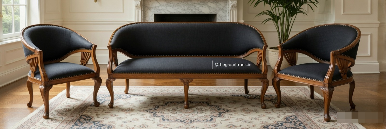The set is upholstered in a premium charcoal-toned fabric, offering a striking, high-contrast aesthetic that feels both traditional and modern. Each piece is meticulously detailed with a rhythmic border of metallic studs, adding a touch of antique-inspired luster to the sleek upholstery. With its deep seating and ergonomic silhouette, this ensemble provides exceptional comfort without sacrificing its formal, heirloom-quality presence. Perfectly suited for a curated lounge or a grand entryway, this sofa set grounds your living space with a sense of history and refined luxury.