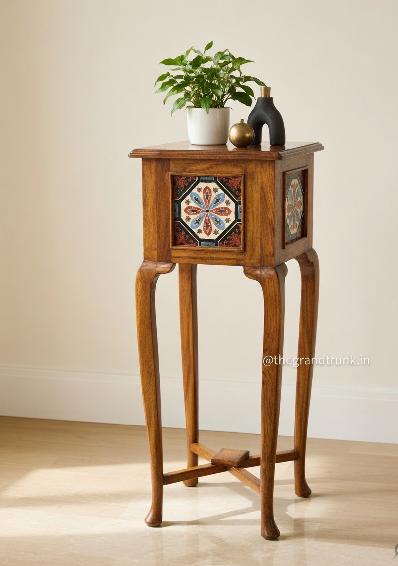 Bring a fusion of traditional artistry and mid-century charm into your home with this stunning Teak Wood Side Table. Expertly crafted from high-quality teak, known for its rich grain and enduring durability, this piece features vibrant, hand-painted ceramic tile inlays that serve as a colorful focal point for any room.