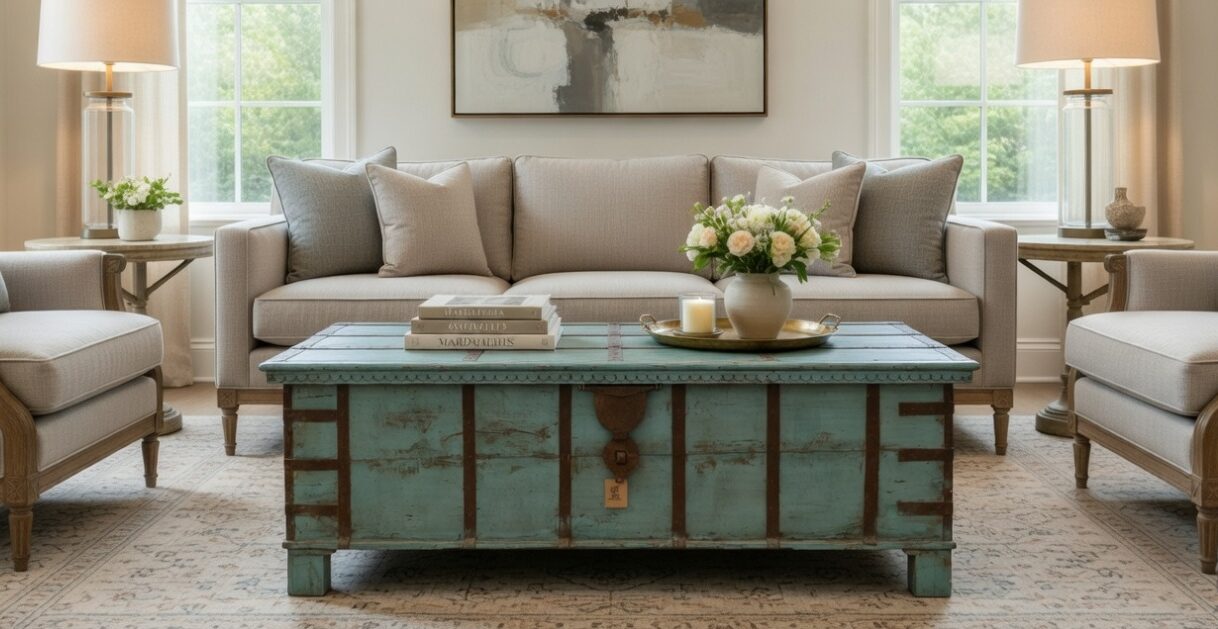 A commandingly rugged statement piece, this handcrafted storage trunk captures the unrefined beauty of antique treasury chests. The piece is defined by its signature weathered patina, featuring a deeply distressed teal finish that highlights the organic textures and hand-carved details of the build. This multi-layered “chippy” finish offers a sophisticated sense of history and permanence, making it a soulful anchor for any curated living space.
