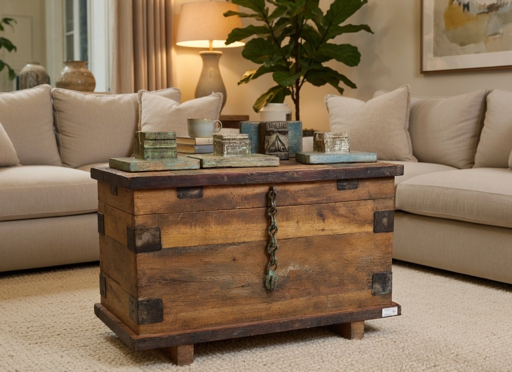 Defining its industrial character is the hand-forged iron chain and hasp assembly, which drapes across the front as a centerpiece of utilitarian art. Verdant oxidation on the ironwork adds a layer of authentic antiquity, while metal corner plates provide structural contrast. Whether utilized as a rugged focal point in a lounge or a functional sanctuary for cherished textiles, this trunk brings an earthy, lived-in luxury to any curated space.