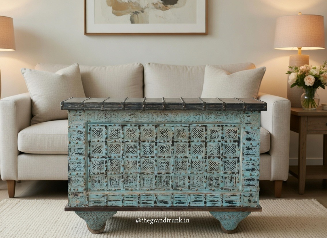 Wooden Storage Trunk is a beautiful storage trunk box made up of solid wood. This wooden trunk can be used as a coffee table. The trunk also features beautiful brass detailing. With ample space for storage, this coffee table cum trunk will surely attract a lot of attention.