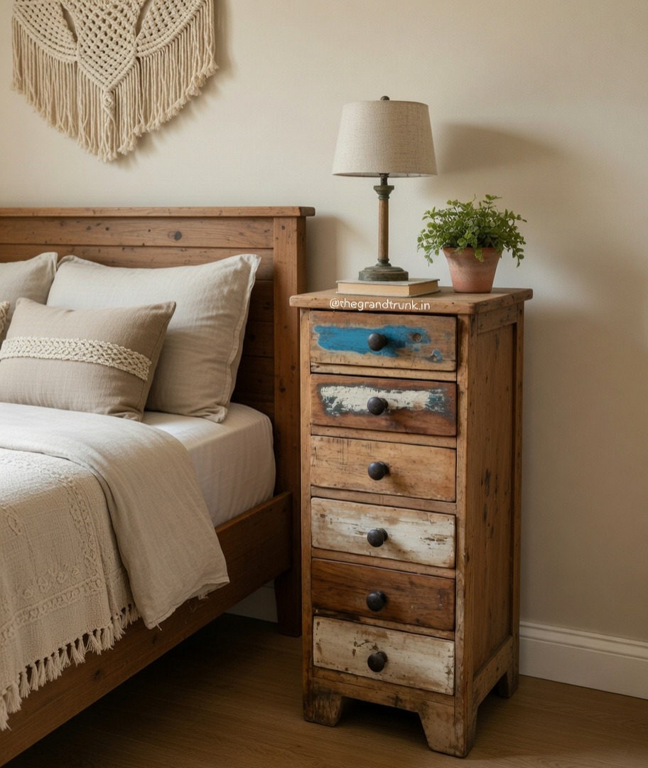 The Reclaimed Wood Bed Side Table with 6 drawers is a charming and functional piece of furniture that brings rustic elegance and ample storage space to your bedroom. The design of the Reclaimed Wood Bed Side Table is often simple and understated, allowing the beauty of the wood to take center stage. The natural imperfections and patina of the reclaimed wood add a sense of warmth and character to the piece, creating a cozy and inviting atmosphere in your bedroom. The size and dimensions of the Reclaimed Wood Bed Side Table can vary, providing options to fit different bedside spaces. Its versatile design allows it to blend seamlessly with various decor styles, including rustic, farmhouse, eclectic, or even modern interiors seeking a touch of vintage charm. Whether used as a standalone piece or as a matching set on either side of the bed, the Reclaimed Wood Bed Side Table with 6 drawers adds warmth, character, and functionality to your bedroom. It is a testament to the beauty of repurposed materials and brings a sense of history and authenticity to your sleeping sanctuary.