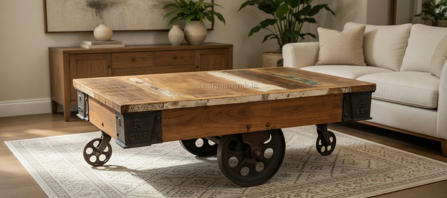 Reclaimed Wooden Coffee Table with Wheels – Rustic Meets Industrial