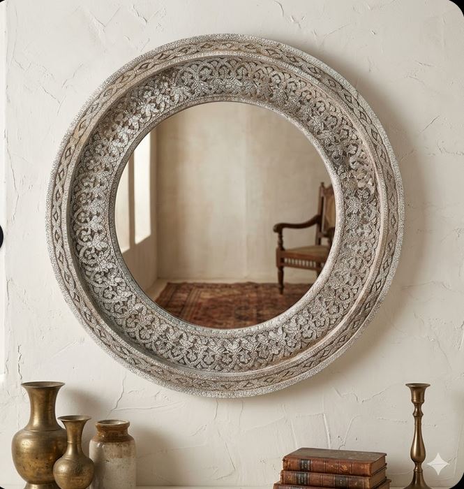 Artisanal Detailing: Features a broad, circular frame with ornate hand-carved motifs inspired by traditional architectural patterns.