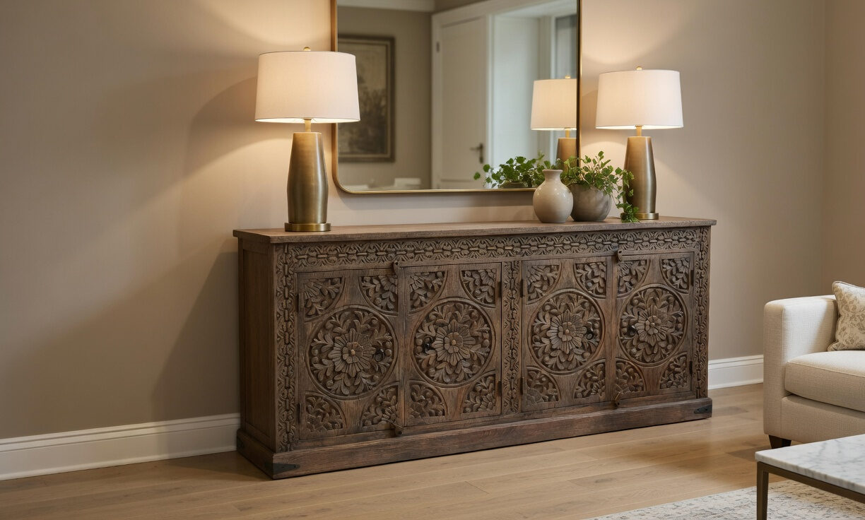 This wooden carved sideboard with brass legs is a stunning fusion of traditional artistry and modern elegance. Handcrafted from solid wood, its surface features intricate carvings that reflect timeless craftsmanship and attention to detail. Resting gracefully on sleek brass legs, the sideboard balances rustic charm with contemporary sophistication. Designed with spacious cabinets and drawers, it offers ample storage while serving as a statement piece in your dining or living area. The warm wood tones paired with the golden sheen of brass make this sideboard a perfect blend of function, durability, and refined style.