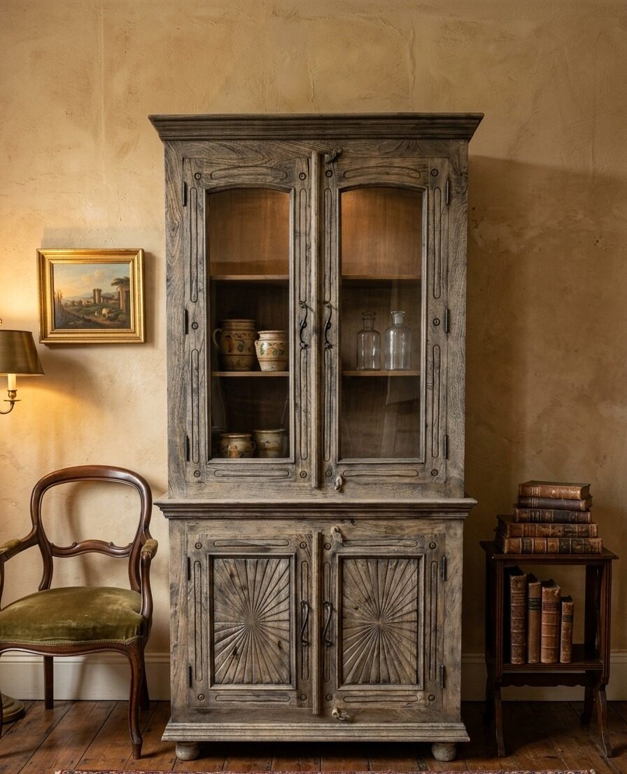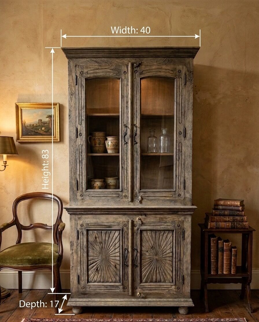 • Glass-Front Display: The upper arched doors feature clear glass panes, perfect for showcasing heirloom ceramics, glassware, or a curated library.