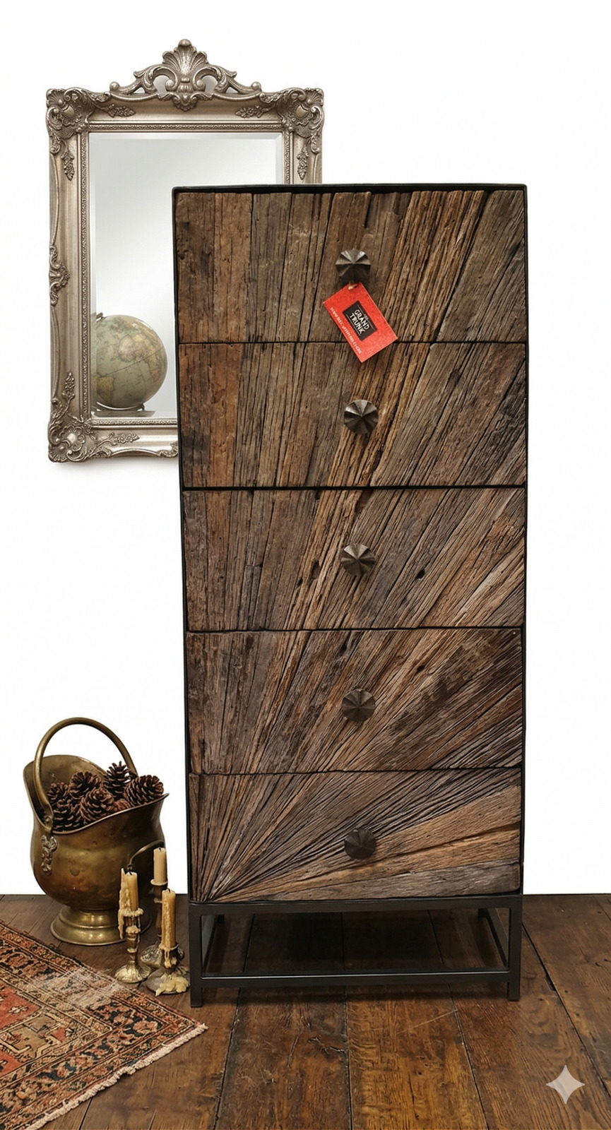 A masterclass in geometric texture, this extraordinary highboy features a striking “sunburst” design handcrafted from reclaimed timber planks. Each drawer is meticulously assembled to create a radiating pattern that draws the eye, turning a functional storage piece into a work of art. Set against a minimalist industrial metal frame, this cabinet perfectly balances the rugged soul of antique wood with a clean, contemporary silhouette.