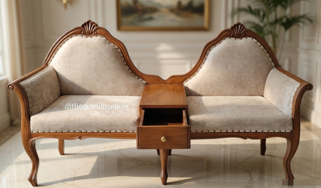 Dual Camelback Design: Elegant twin backrests adorned with hand-carved fan motifs and architectural fluting.