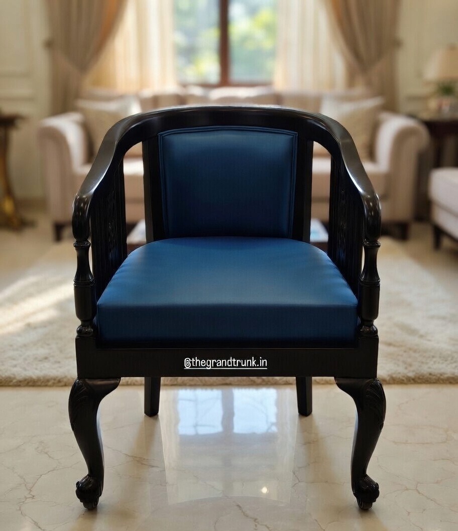 The chair is upholstered in a premium royal blue fabric, offering a vibrant, jewel-toned luster that creates a high-impact aesthetic. With its deep-seated comfort and ergonomic profile, this piece is supported by hand-sculpted cabriole legs featuring traditional leaf motifs and stable ball-and-claw feet. Whether utilized as a standout accent in a master lounge or as a sophisticated addition to a boutique office, this heritage chair grounds your space with artisan soul and enduring luxury.