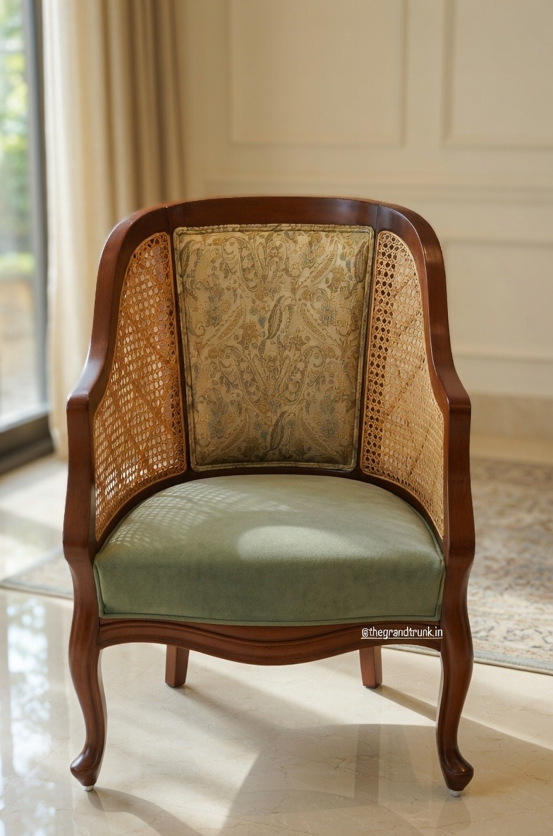 The chair features a sophisticated dual-fabric upholstery: a plush sage green velvet-style seat for deep comfort, paired with a curated floral tapestry backrest in muted earth tones. This combination creates a striking visual depth that feels both traditional and fresh. With its ergonomic wraparound profile and artisan detailing, this piece serves as a timeless focal point. Whether utilized as a reading chair in a sun-drenched nook or a statement piece in a master suite, it grounds your space with heritage soul.