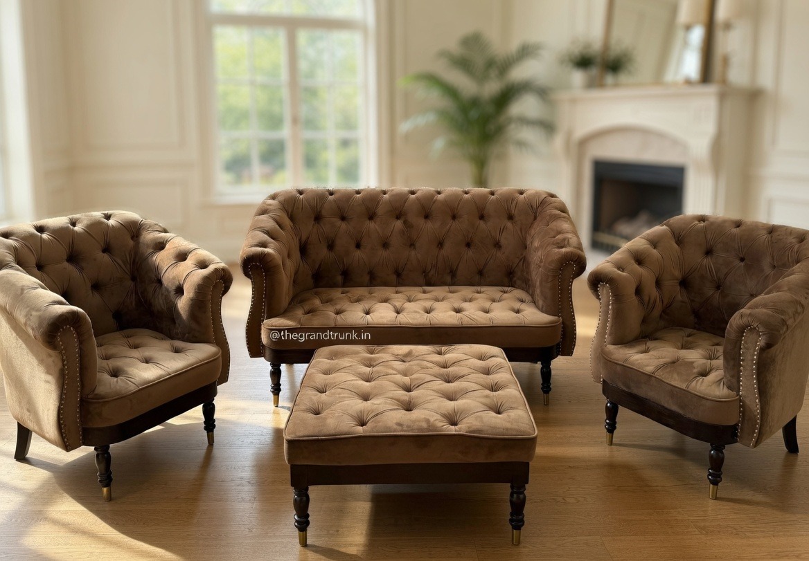 A masterful expression of timeless opulence and tailored comfort, this handcrafted collection serves as a majestic anchor for the sophisticated home. The suite features a grand three-seater sofa, two matching tub-style armchairs, and a coordinated tufted ottoman, all defined by iconic deep-button diamond tufting. The rich mocha velvet-style upholstery offers a multidimensional luster that catches the light beautifully, creating an atmosphere of curated luxury.
