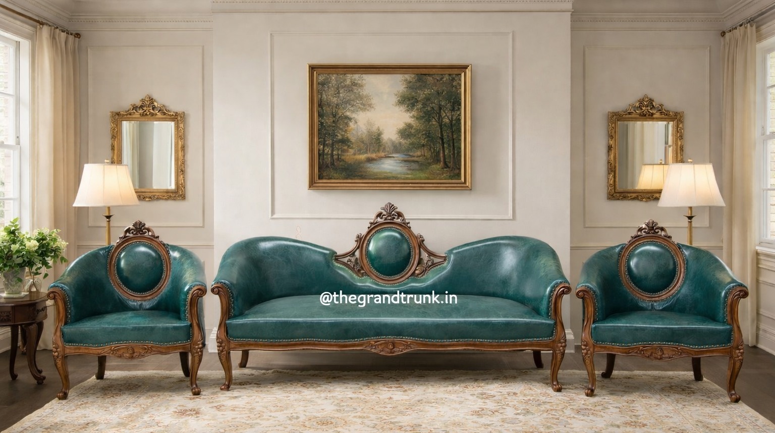 The ensemble is upholstered in a premium emerald teal leather-style fabric, offering a rich, luminous texture that creates a high-impact contrast against the dark wood tones. Meticulous hand-applied brass stud detailing lines the edges, adding a touch of antique-inspired luster to the tailored finish. Set upon sturdy, hand-sculpted cabriole legs, this collection offers an unrivaled sense of old-world sophistication and heirloom-quality presence. Whether placed in a grand formal lounge or a high-end reception suite, it grounds your interior with artisan soul and regal luxury.