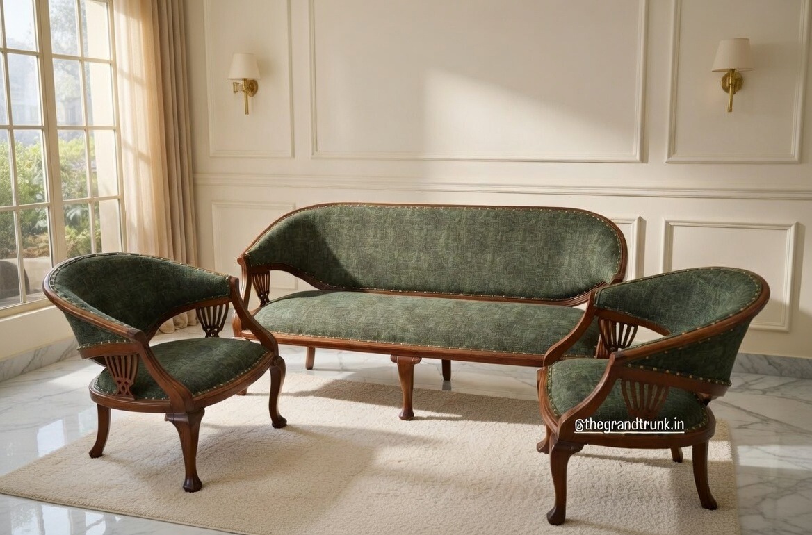 The set is upholstered in a premium forest green textured fabric, offering a rich, botanical aesthetic that feels both traditional and fresh. Each piece is meticulously detailed with a rhythmic border of metallic studs, adding a touch of antique-inspired luster to the sleek upholstery. With its deep seating and ergonomic, wraparound silhouette, this ensemble provides exceptional comfort without sacrificing its formal, heirloom-quality presence. Perfectly suited for a curated lounge or a grand entryway, this sofa set grounds your living space with a sense of history and refined luxury.