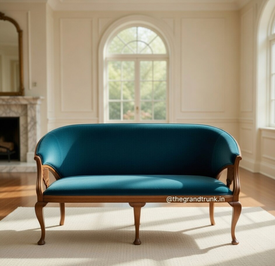 The sofa is upholstered in a premium peacock teal velvet-style fabric, offering a rich, jewel-toned aesthetic that feels both traditional and modern. With its deep seating and ergonomic, wraparound silhouette, this settee provides exceptional comfort without sacrificing its formal, heirloom-quality presence. Whether placed in a formal lounge, a grand entryway, or a master suite, this sofa grounds your home with a sense of history and refined luxury.