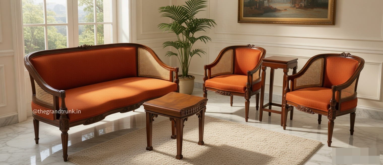 A masterful expression of classical elegance and vibrant warmth, this handcrafted seating collection brings a refined Parisian aesthetic to the modern home. The set features a graceful three-seater sofa with a unique curved silhouette and two matching barrel-style armchairs. The design is defined by its intricate woven cane side panels, providing an airy, architectural texture that balances the substantial weight of the dark frames.