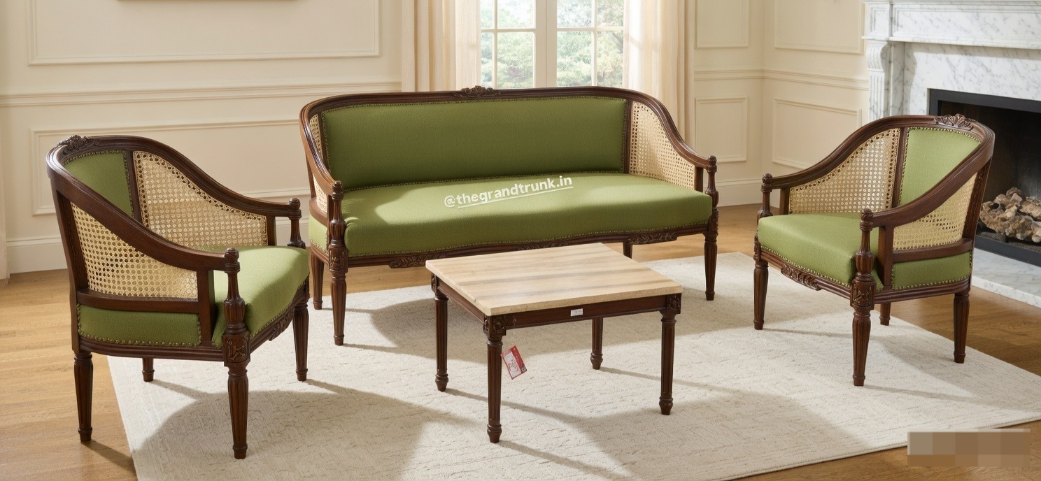 A masterful expression of classical elegance and botanical charm, this handcrafted seating collection brings a refined Parisian aesthetic to the modern home. The set features a graceful three-seater sofa with a unique curved silhouette and two matching barrel-style armchairs. The design is defined by its intricate woven cane side panels, providing an airy, architectural texture that balances the substantial weight of the frames.
