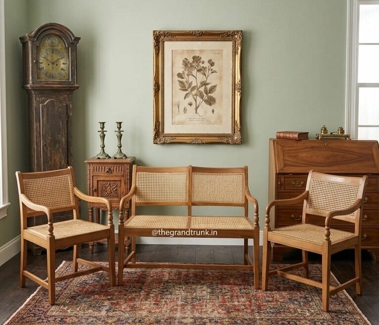 Artisan Cane-Woven Heritage Sofa Set – Honey-Glazed Colonial Seating