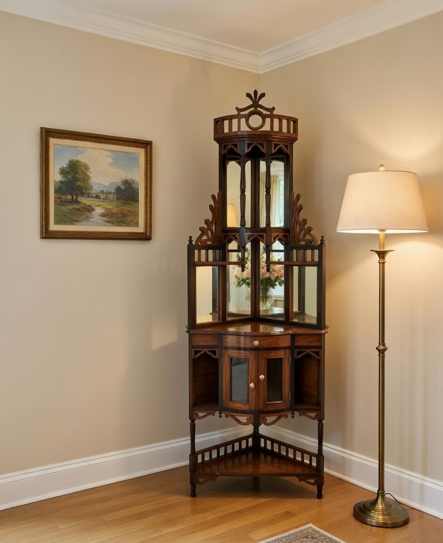 • Design Elements: Mirror-backed tiers, intricate fretwork detailing, and a glass-front lower cabinet.
