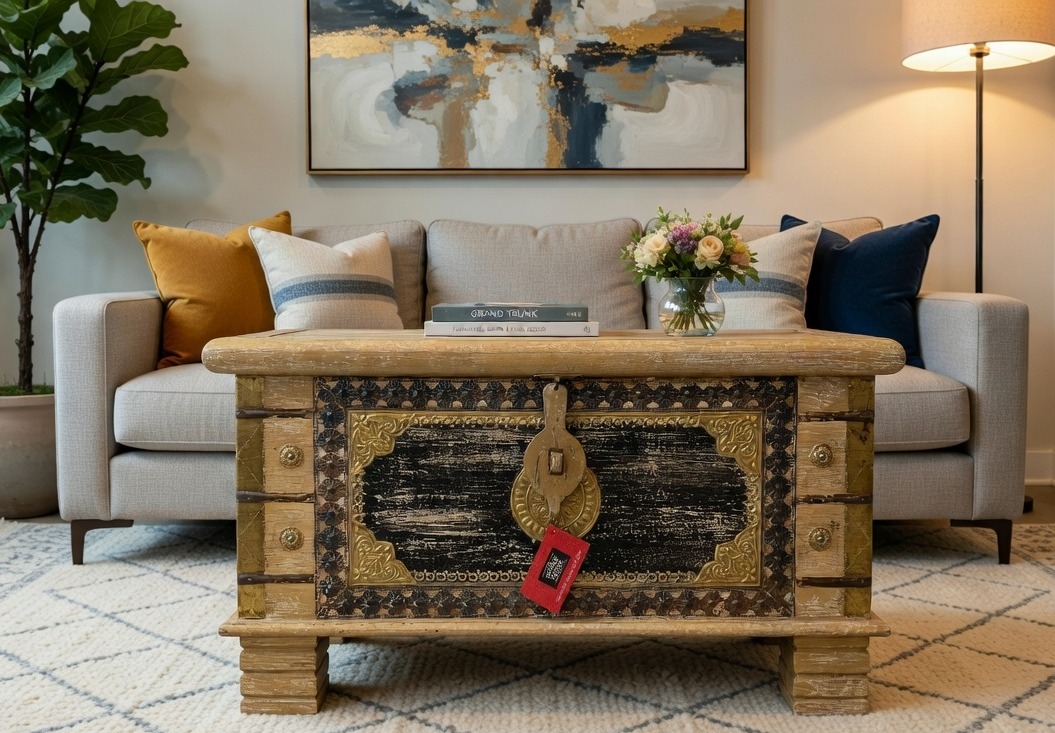 Beyond its striking visual presence, this chest is a study in functional craftsmanship. Authentic iron-bound strapping and a substantial central hasp reinforce its vintage traveler’s silhouette, while the solid wood construction ensures an enduring legacy. Whether utilized as a conversational coffee table or a sophisticated sanctuary for heirloom textiles, this trunk grounds a room with a sense of history and artisan soul, making it a definitive statement piece for the curated home.