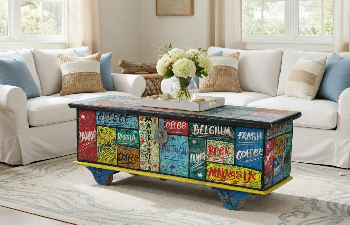 Inject a bold, adventurous spirit into your living space with this one-of-a-kind hand-painted storage trunk. A vibrant tribute to the golden age of travel, the piece features a captivating “passport” facade adorned with colorful typography and motifs representing iconic global destinations. The multi-tonal palette of crimson, azure, and ochre is softened by a specialized distressed finish, giving it the authentic look of a well-traveled heirloom.