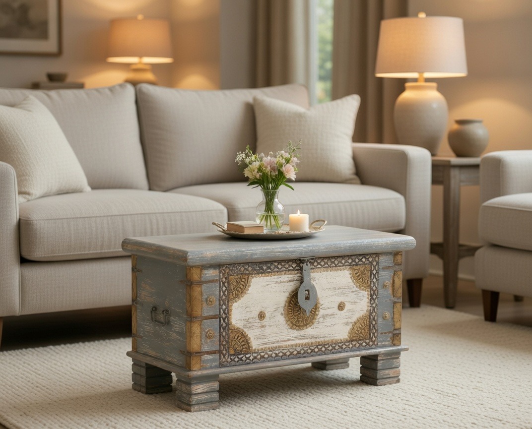 Inspired by the storied treasury chests of a bygone era, this handcrafted storage trunk is a magnificent marriage of rustic texture and refined metallic artistry. The piece is finished in a signature distressed slate gray, where the weathered wood grain provides a dramatic, high-contrast backdrop for the ornate cream-washed central panel. This multi-layered patina offers a sophisticated, time-worn aesthetic that feels like a rare heirloom discovery.