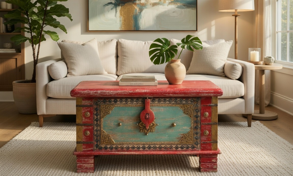 Infuse your living space with the vibrant energy of heritage-inspired design. This artisan storage trunk is a masterwork of color and texture, featuring a striking hand-distressed crimson finish that reveals the raw, organic character of the wood beneath. The central panel, finished in a weathered seafoam teal, provides a serene contrast, framed by intricate geometric carvings and hand-embossed brass metalwork that speaks to a time-honored tradition of craftsmanship.