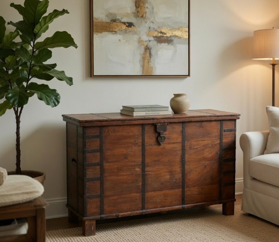 The trunk is finished with an authentic iron latch and side-mounted handles, evoking the feel of a vintage traveler’s chest. Beyond its striking visual presence, it offers an expansive interior, providing a sophisticated solution for stowing bulky linens, collectibles, or seasonal keepsakes. Elevated on sturdy block feet, this chest brings a sense of grounded history and enduring character to any curated interior.