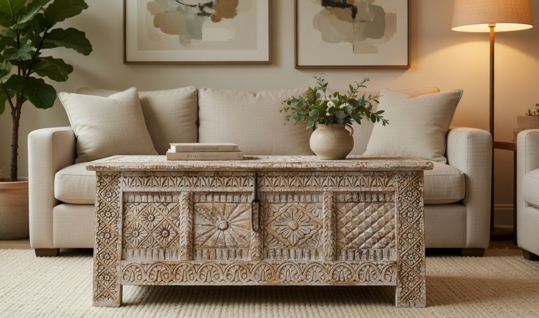 Spaces: A stunning coffee table in a formal lounge, a functional storage bench in a grand entryway, or a heritage accent piece at the foot of a bed.