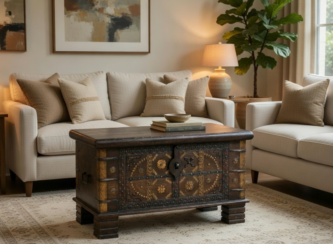 Beyond its striking visual presence, this chest is a study in functional craftsmanship. Authentic iron-bound strapping and a substantial central hasp reinforce its vintage traveler’s silhouette, while the solid wood construction ensures an enduring legacy. Whether utilized as a conversational coffee table or a sophisticated sanctuary for heirloom textiles, this trunk grounds a room with a sense of history and artisan soul, making it a definitive statement piece for the curated home.