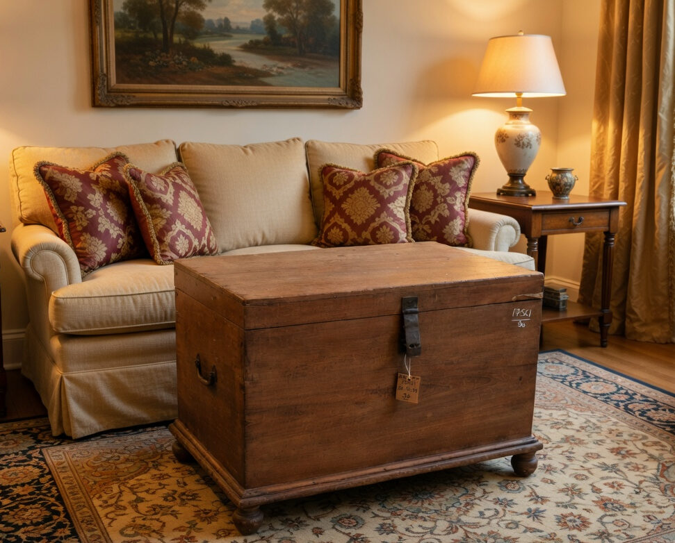 Designed for both form and function, its expansive flat-top surface makes it an ideal choice for a conversational coffee table or a striking focal point at the foot of a bed. Beyond its visual allure, the trunk offers a deep, high-capacity interior, providing a discreet sanctuary for stowing everything from heirloom textiles to modern essentials. Set upon a sturdy plinth base with traditional bun feet, this trunk grounds any room with a refined, rustic luxury and artisan soul.