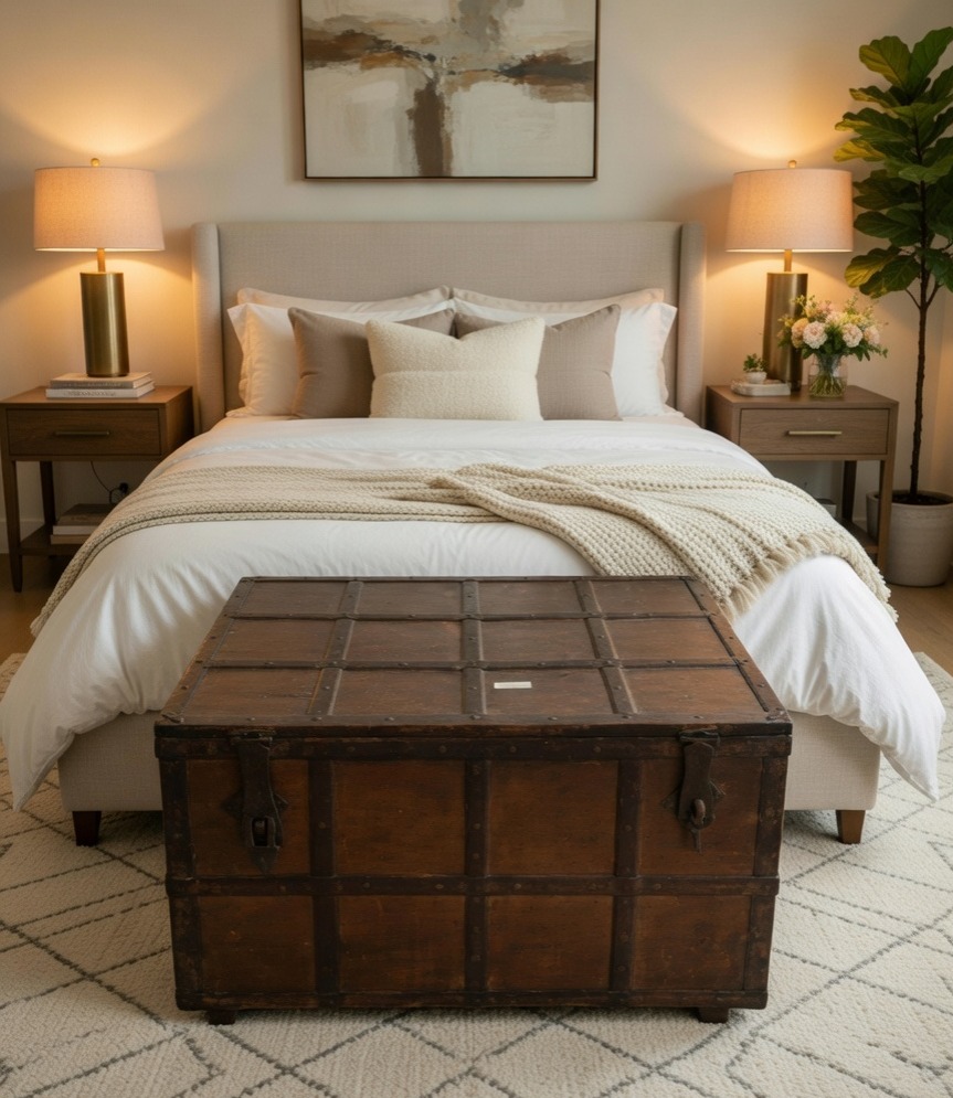 The rich, dark wood tones combined with the weathered metal surface create a striking contrast, making it a standout addition to any living room, bedroom, or studio space. Its spacious interior offers practical storage for blankets, cushions, books, or collectibles, while the sturdy flat top allows it to double as a unique coffee table or statement centerpiece.