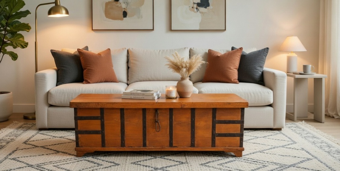 Designed with a classic front latch and strong base support, this trunk can also double as a low bench or coffee table, making it both functional and stylish.