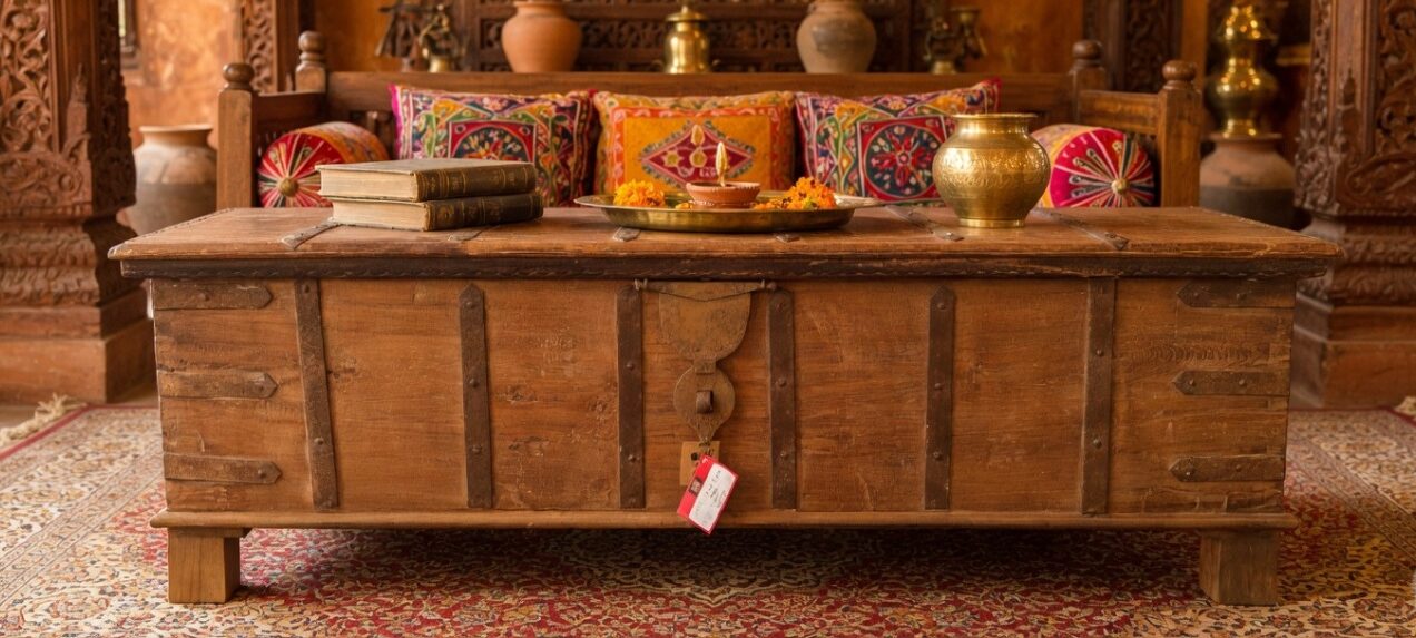 Heavy-Duty Forged Hardware: Features an authentic central hasp and locking assembly, echoing the design of vintage treasury chests.
