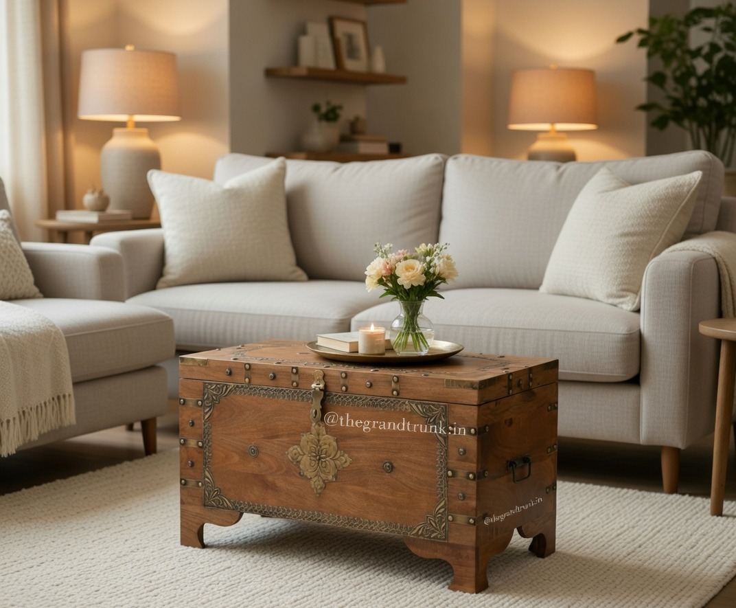 Inspired by the storied treasury chests of a bygone era, this handcrafted storage trunk is a magnificent marriage of organic warmth and refined metallic artistry. The piece is finished in a rich, natural honey stain that celebrates the vibrant grain and unique character of the material, offering a timeless aesthetic that anchors any room with a sense of history.