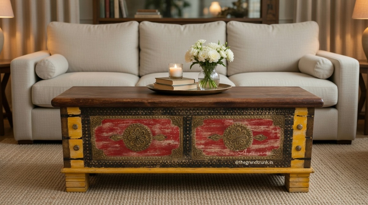 Inspired by the storied treasury chests of a bygone era, this handcrafted storage trunk is a magnificent marriage of rustic texture and refined metallic artistry. The piece is defined by a sophisticated tri-tone aesthetic: a deep mahogany-finished lid, a distressed ochre-yellow frame, and vibrant crimson-washed central panels. This multi-layered “chippy” patina offers a time-worn, high-end luxury that feels like a rare heirloom discovery.