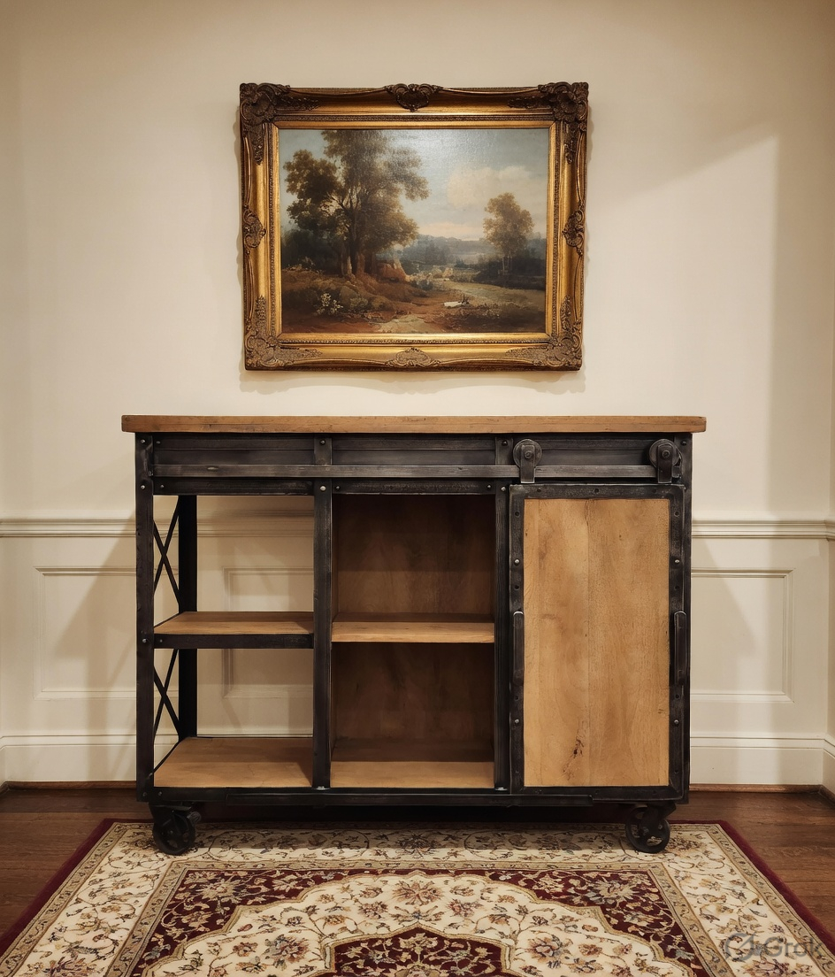 Check out this industrial sideboard, It’s functional stylish and sure to impress your guests. Transform your space with this amazing industrial sideboard! The perfect blend of wood and iron for a unique touch. The combination of wooden charn and iron wheels adds a touch of industrial chic to any room.