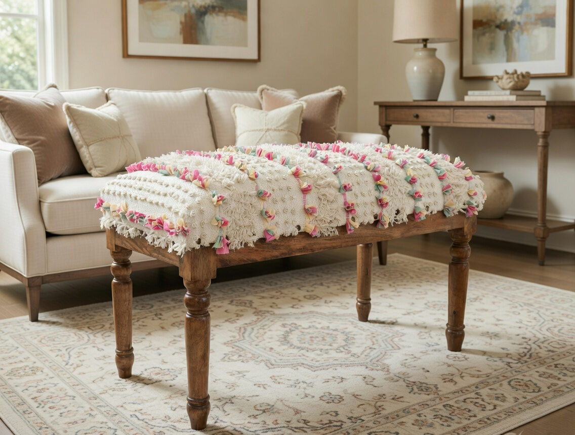 This wooden bench with a cushion is a perfect marriage of style and comfort. Crafted from a rich sturdy wood it exudes an elegant and timeless charm. The smooth grains of the wood showcase its natural beauty adding warmth and character to any space it occupies. The bench features a cushioned seat that provides a plush and cozy sitting experience. The cushion is upholstered in a soft durable fabric meticulously chosen to complement the bench’s design. It offers a delightful balance between support and comfort allowing you to relax for extended periods. Its sturdy construction ensures stability and longevity while the graceful curves and sleek lines add an element of sophistication. Whether placed in a garden on a patio or in a hallway this wooden bench with a cushion effortlessly enhances the aesthetic appeal of any environment. It serves as a welcoming spot in an entryway creating a cozy nook to help transition into a home. Placed in a garden or courtyard it offers a serene and inviting place for contemplation and relaxation. Additionally the bench can be used in a living room or a dining area adding a touch of adorable charm to the overall decor. This wooden bench with a cushion is an elegant and comfortable seating option that seamlessly blends into any space while adding a touch of natural beauty. Its inviting design and practicality make it an ideal choice for those who appreciate both aesthetics and comfort.