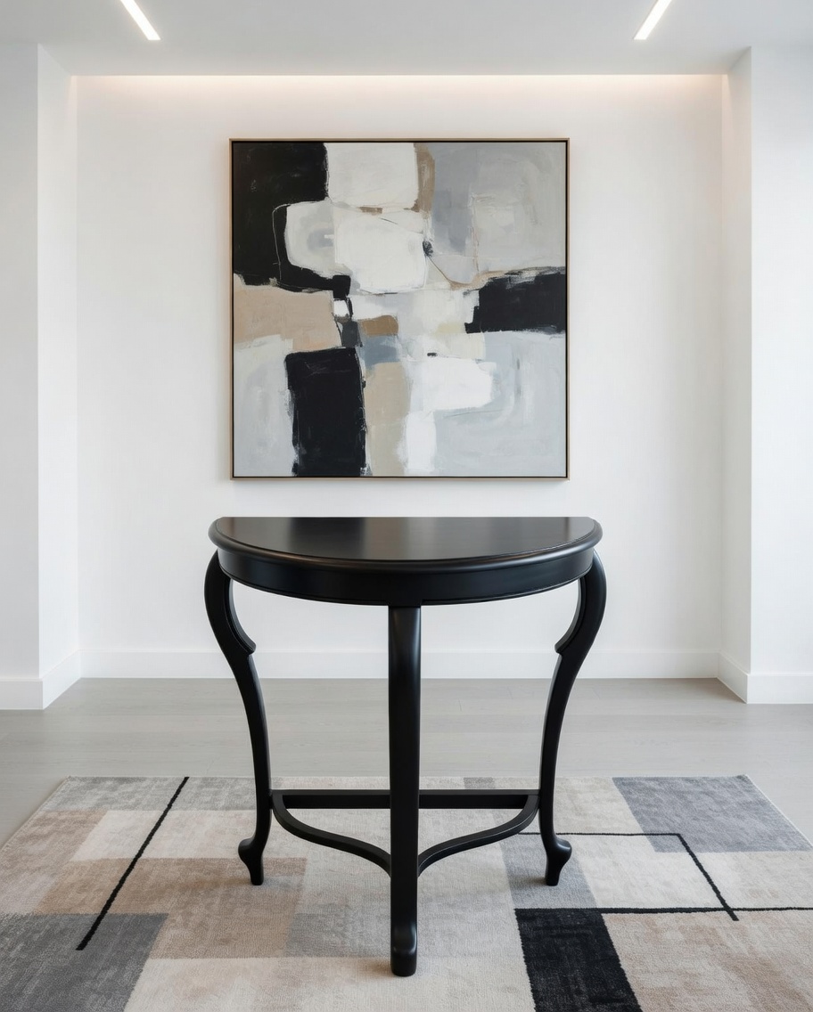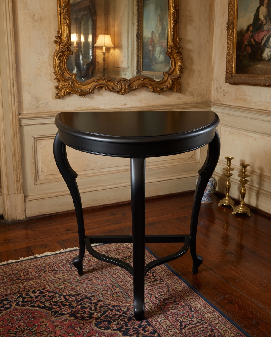 The half moon console also known as a demilune console is a furniture piece that features a half-circle or semi-circular shape. It typically has a flat top surface that extends outward in a semi-circle with one straight edge against a wall and the other half exposed. This design allows it to be placed flush against a wall while still providing a decorative and functional element to a space. Half moon consoles are often utilized in entryways or hallways as a stylish accent piece. They can also be used in living rooms bedrooms or any other area where a compact and unique surface is needed. These consoles often feature a slender profile making them suitable for narrow spaces.