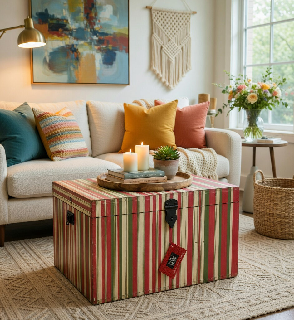 Inject a playful yet sophisticated energy into your living space with this vibrant, hand-painted storage trunk. A modern take on the traditional traveling chest, this piece features a rhythmic vertical stripe pattern in a warm palette of crimson, sage green, and cream. The specialized distressed finish softens the bold lines, creating a weathered, “lived-in” charm that fits perfectly into a curated home.