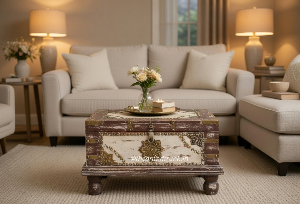 Wooden Storage Trunk is a beautiful vintage storage trunk box made up of solid wood in a distressed finish. This wooden trunk can be used as a coffee table. The trunk also features beautiful brass detailing. With ample space for storage, this coffee table cum trunk will surely attract a lot of attention.