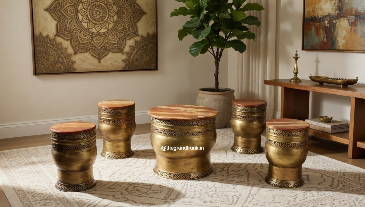 A masterful celebration of traditional Indian metalwork and organic texture, this handcrafted 5-piece ensemble brings a sense of curated history to the modern living space. The set features a grand circular center table paired with four matching pedestal stools, all defined by their signature drum-shaped silhouettes and hand-beaten brass-tone cladding. The specialized metallic finish offers an antique-inspired luster that catches the light, highlighting the rhythmic, hand-punched lattice patterns that adorn the base of each piece.