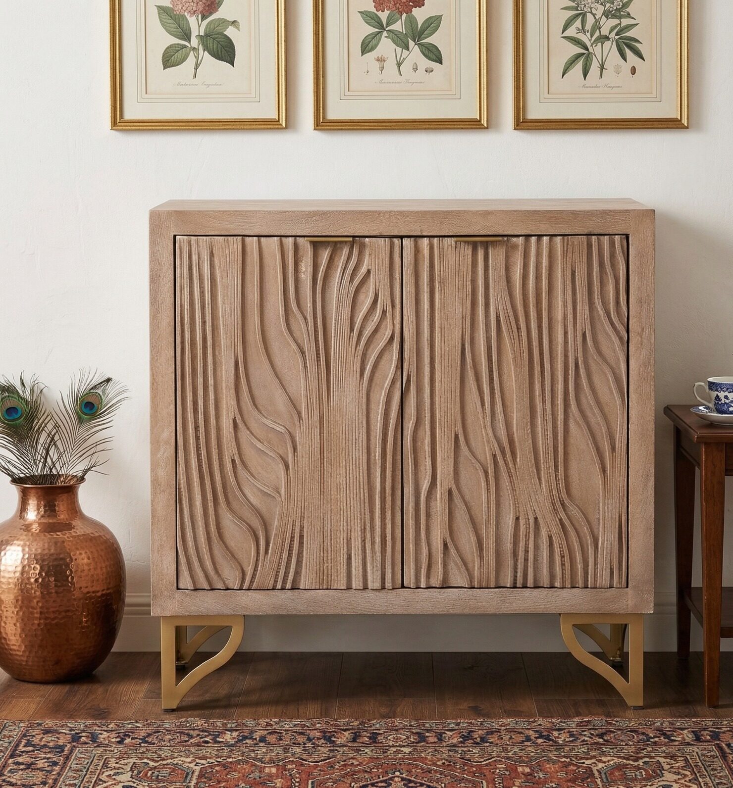- This wooden carved cabinet with brass legs beautifully blends craftsmanship with modern elegance. Handcrafted from solid wood, the cabinet features intricate carvings that showcase timeless artistry and detail. Resting on sleek brass legs, it strikes the perfect balance between traditional design and contemporary sophistication. With spacious storage inside, it’s as functional as it is stylish—ideal for organizing essentials while adding a statement look to your living or dining space. The natural wood texture, paired with the warm metallic glow of brass, makes this piece a refined addition to any interior.